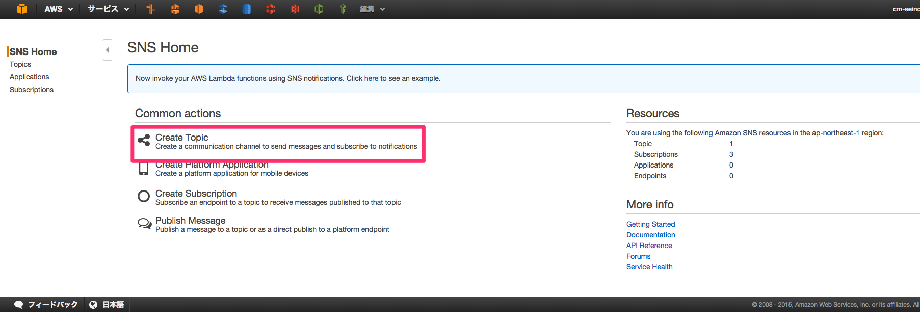 設定方法はとても簡単です。まずマネージメントコンソールからSNSにいき、新しいTopicを作ります。IPレンジのアップデート通知はus-east-1、北米リージョンで行われるためSNSのリージョンも北米リージョンにて行います。