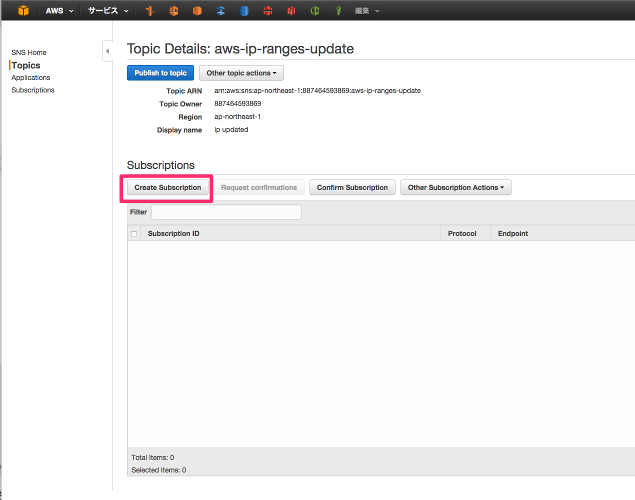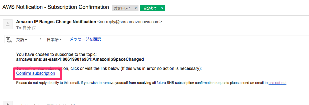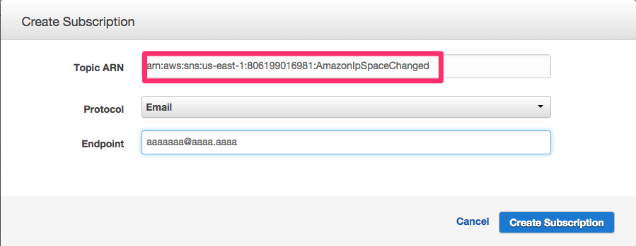 subscriptionの[Topic ARN]に通知用のARN[arn:aws:sns:us-east-1:806199016981:AmazonIpSpaceChanged]を入れます。今回はEmailで通知してもらうことにします。