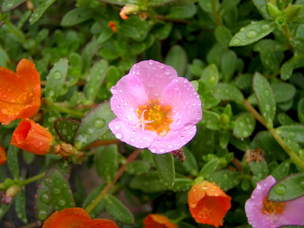 雨に濡れた松葉牡丹が。