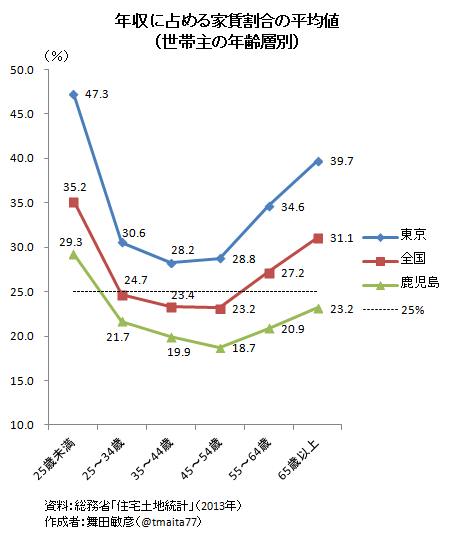 それに比して,わが郷里の鹿児島は状況が幾分かマシです。25歳未満を除いて,キツイ目安のライン(25%)を下回っています。収入は東京よりは少ないですが,家賃もうんと安い。向こうなら,4万円出せば部屋2つのマンションを借りれますしね。働き盛りの層の家賃割合が2割を切るというのも,さもありなんです。
