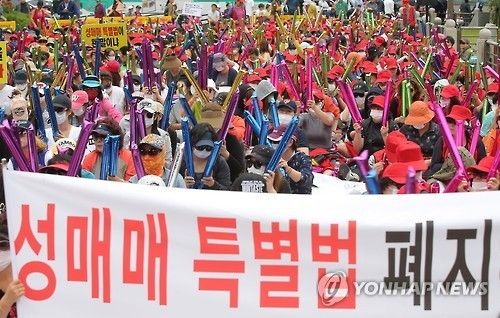 売春斡旋などの行為の処罰に関する法律(売春特別法)施行11周年に合わせて、売春従事者がソウル都心で特別法廃止を要求する大規模な集会を開いた。