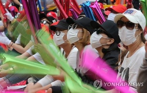 この日の集会の参加者は、ほとんどが黒のサングラスと白いマスク、赤帽子で顔を隠していた。