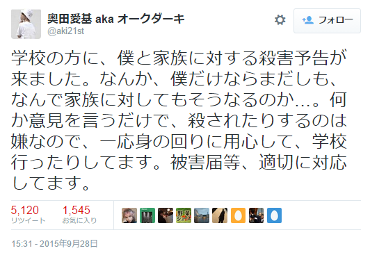 奥田氏はSEALDsの中心メンバーのひとりで、安全保障関連法案が憲法9条に違反しているとして抗議行動を展開している。投稿によると、奥田氏が学生として籍をおく明治学院大学に、彼とその家族に対する殺人予告が送られたという。