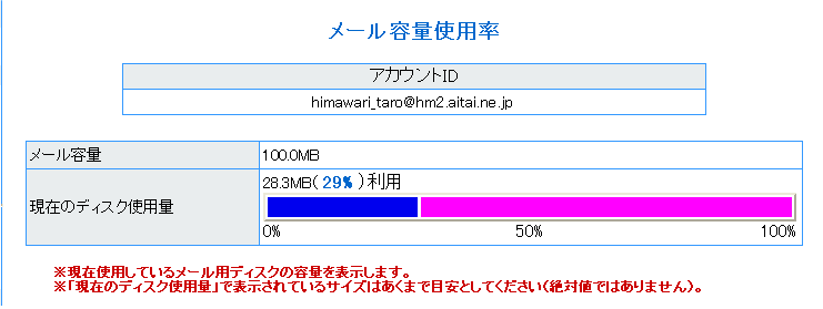 | 【メール容量使用率】 | 現在ご利用いただいているメールサーバの使用率を確認することができます。 |