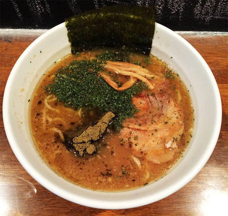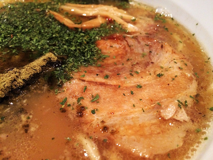 バジルにも似た香ばしさが特徴で、丸くてほどよい硬さの麺がマッチして美味しい。チャーシューは箸でつまんだだけでホロホロと崩れ落ちるほど薄く、これがまたスープをよく吸収して美味。