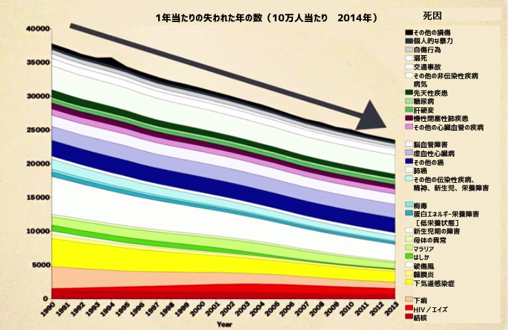 だが唯一の良いニュースは、全てのカテゴリーにおいて世界的に「失われた年」は減少を続けている。つまり、寿命が長くなり生き延びている人が増えているということである。そう考えれば、このニュースもそれほど悲しいニュースには聞こえないだろう。