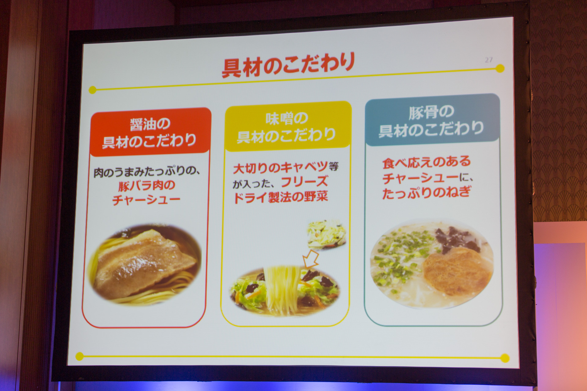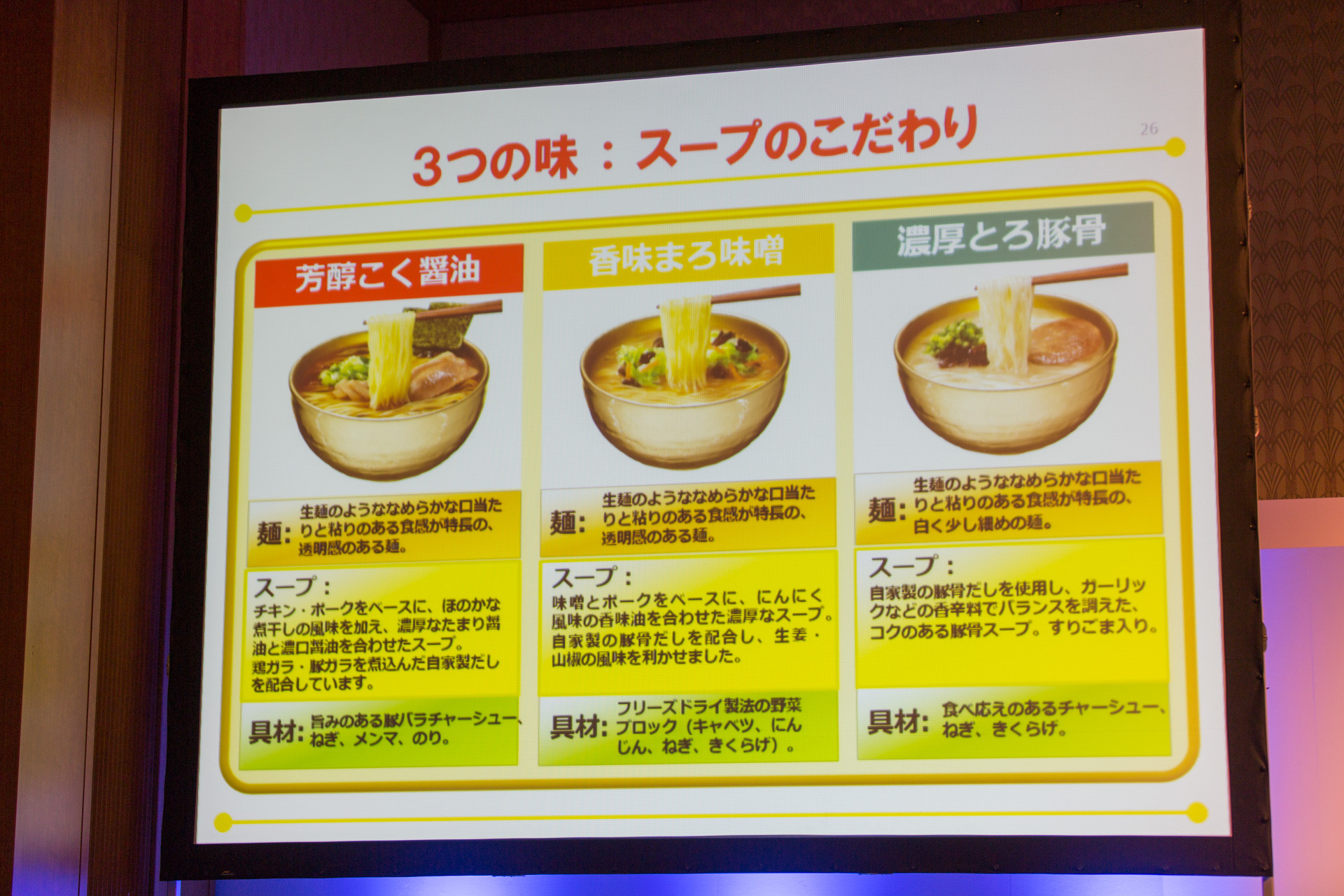 そして具材も、麺やスープに負けないこだわりよう。チャーシューは噛んだときにうまみをたっぷりと感じられる新しいチャーシューを開発し、味噌はフリーズドライにした大切りの野菜が、そして豚骨にはたっぷりのネギが使われているそう。
