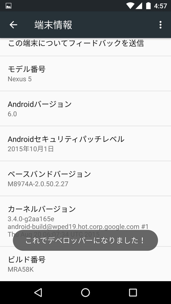 以下、実際にNexus 5にAndroid Mを導入してみた主な画面のキャプチャー。毎度のことながら、技適マークがあってひとまず安心(;´Д`)
