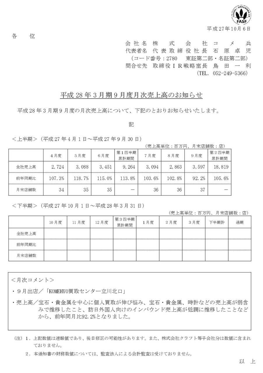 2015/10/06 16:00 コメ兵 平成28年3月期9月度月次売上高のお知らせ