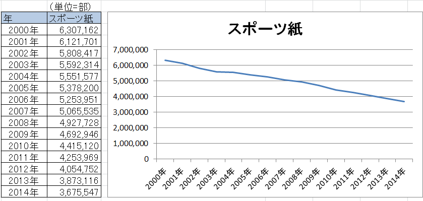 スポーツ新聞って普通紙以上にネットに取って代わられやすい気がするんですよね。プロ野球の試合結果とかヤフーの速報で十分だし、選手の談話とかも大概はネットで読めてしまう。かなり苦しいんじゃないだろうかと思って調べてみました。