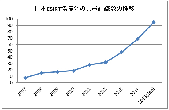 世界中でサイバー攻撃が激化する昨今、日本企業では、セキュリティ管理部署を設立したり、セキュリティ管理者を増員したりと人材面の投資を増やす傾向がある。2007年に設立した日本CSIRT協議会は順調に加盟組織数を伸ばしており、2014年末の時点で69チーム、2015年9月時点では95チームに及んでいることからも、このトレンドが読み取れる。(下図)