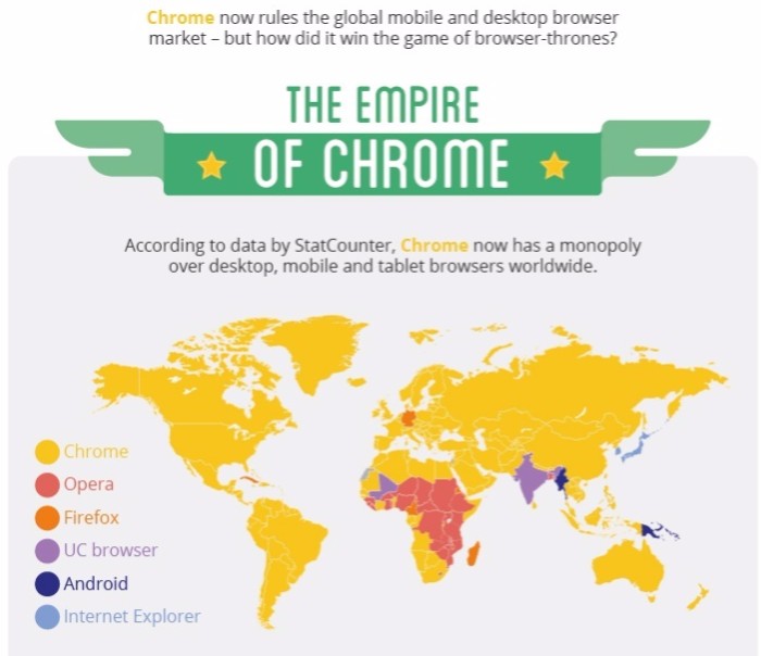XP買い替えで売れらアメリカに対し、日本でChromeOS搭載機は話題になりませんでしたね。もっともこれ、設定同期などの都合上、ChromeOSは普段使いのブラウザがChromeである人が最大のメリットを享受出来るOSなので、Internet Explorerがシェア1位の日本では、メリットを享受出来る人が少ないのもあるのかもしれません。| 国別のシェア1位ブラウザ(netimperative.comよりCC4.0ライセンスで引用・抽出) |