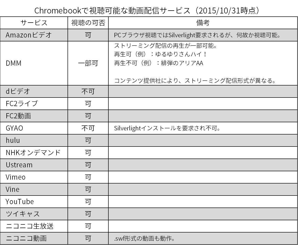 というわけで、ブラウザやプラグインによる影響を受けやすい、動画配信サービス、電子書籍サービスについて、Chromebookで見られるかどうかをちょっと調べてみました。結果は以下の通り。