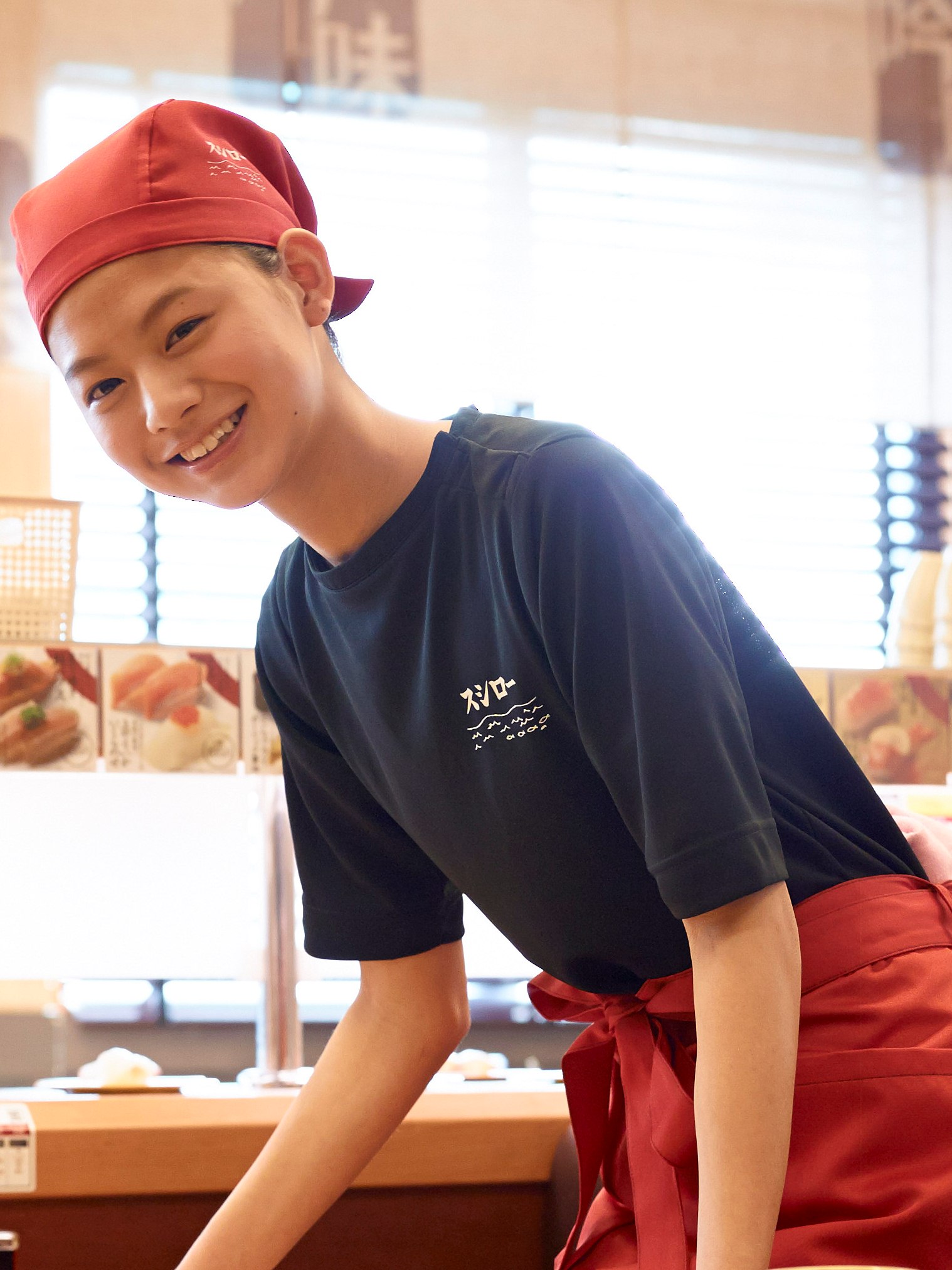 制服単体の写真が見つからず。赤いシャツに緑のエプロンという印象