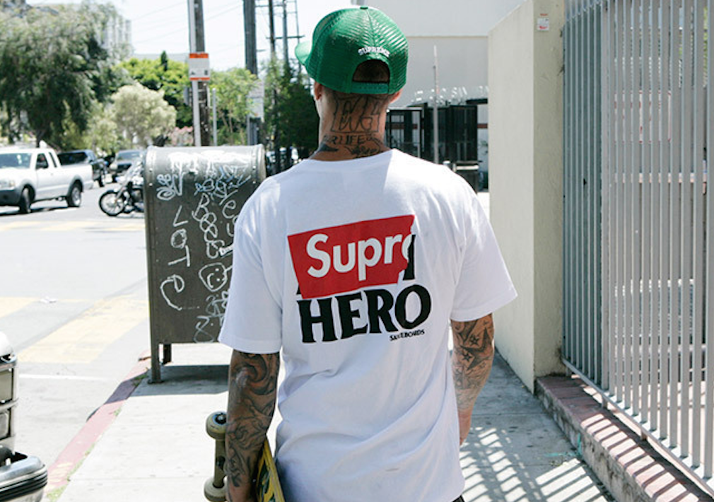 Supreme x Anti HeroのコラボTシャツは赤帯の白文字を