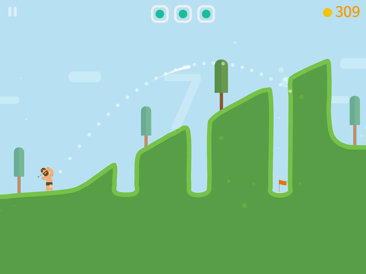 パンツ一丁のヒゲのおじさんがひたすらホールインワンを狙うゲームです。地形がトリッキーな上、時々強い風が吹いてきておじさんを困らせます。パットを決めるとコインがもらえ、500コイン集めると、おじさんのバリエーションを1つずつ集めていくことができます。