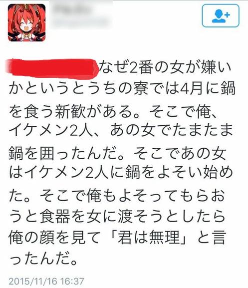 この女ブサイクで話が本当なら性格悪いけど、拒否られてつぶやいてる男も残念な奴だな