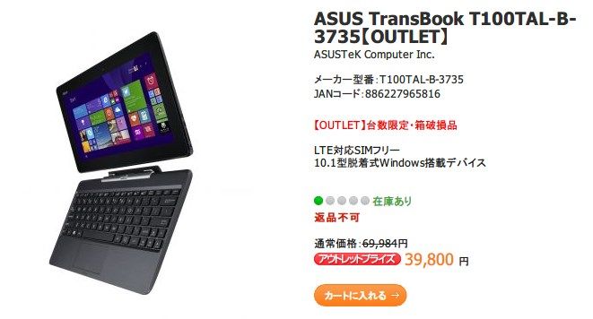 この記事を書きながら何気なくASUS Shopを覗いてみたら、T100TALがアウトレット品として販売されていました。