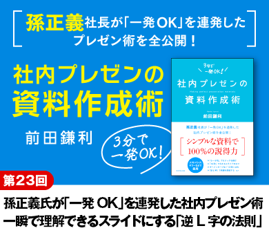 社内プレゼンはビジネスパーソン必須のスキル。ところが、多くの人が苦手ではないでしょうか?何度も却下されたり、差し戻しにあったり……。そこで、ソフトバンクで孫正義氏から「一発OK」を何度も勝ち取った著者が、秘伝のノウハウを詰め込んだ『社内プレゼンの資料作成術』を発刊。大きな反響を呼んでいます。この連載では、本書から、シンプルな資料で100%の説得力を生む、「超」実践的なノウハウをピックアップしてお伝えします。