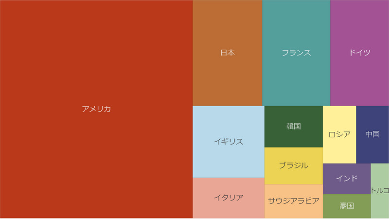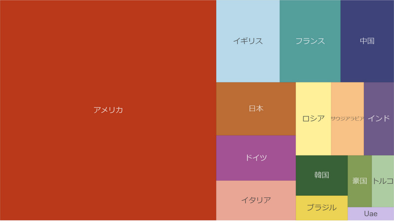 そこで今回は視認性を重視して、全体に占める面積で数値の大きさを表すツリーマップ表現を用いてみたいと思います(本来のツリーマップは階層構造を表現するものですが……)。トップ15の中で、どの国がどれだけ防衛費を使っているかがよく分かると思います。