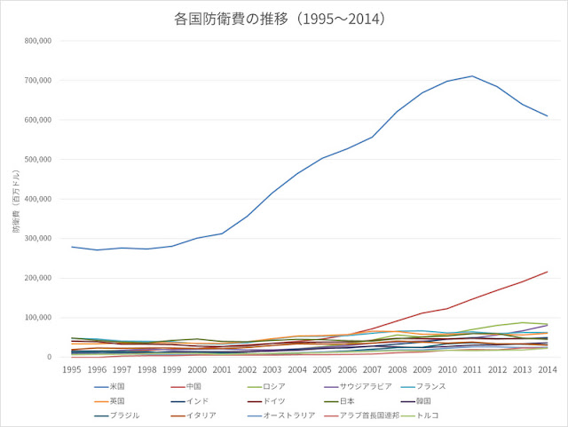 それでは、現在集計・公表が済んでいる2014年の防衛費トップ15を見てみましょう。一般的に防衛費の推移は、折れ線グラフを用いて表現される事が多いです。しかし、1位が圧倒的で2位以下が近い額で固まっている防衛費を折れ線グラフで表すと、下のグラフのように線が密集して比較しづらい問題がありました。| 防衛費トップ15国の防衛費の20年間の推移 |