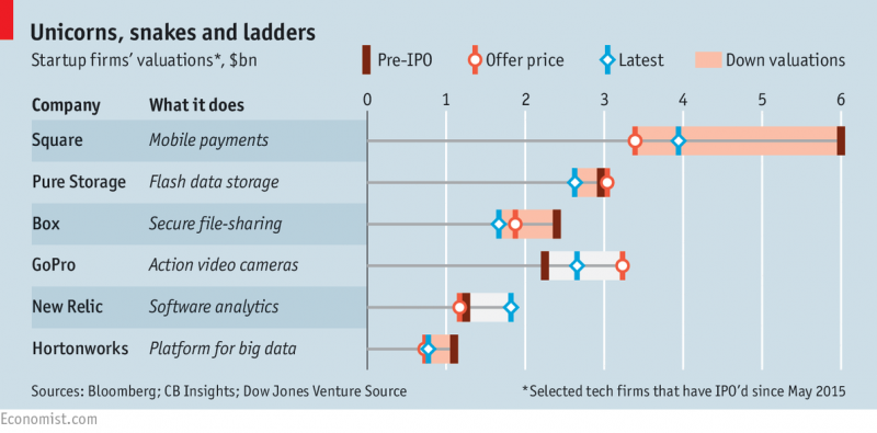 イギリスのビジネス誌「The Economist」(2015年11月28日号)では「The rise and fall of the unicorns」というタイトルで、このような新興企業の行く末に関して取り上げています(グラフも同誌から引用)。