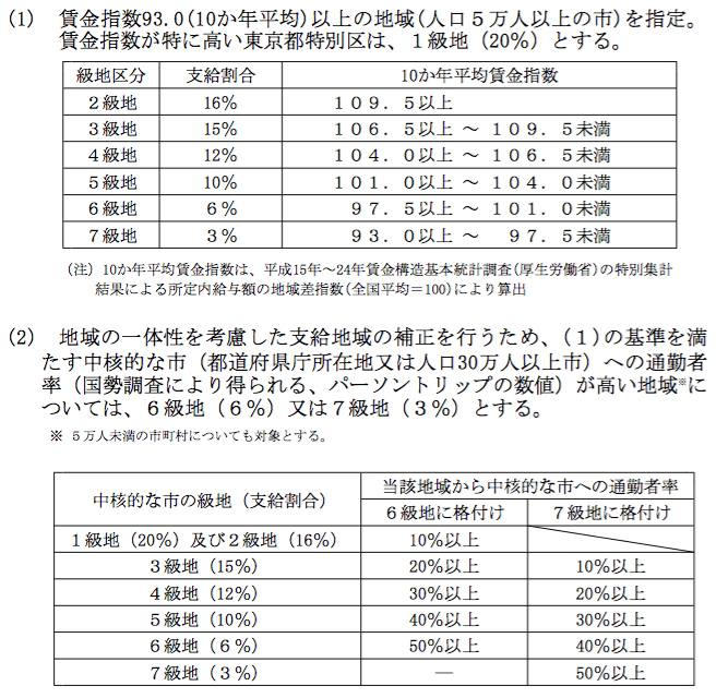 支給基準の不可解な点についても同調査から確認したが何ら納得の出来るものではない。全ての自治体を賃金指数による(1)の対象としない理由は、人口5万人未満の自治体には賃金指数の算出がないことを理由としている。この理由から通勤者率を用いた(2)に関しては、基準結果の級地区分を2段階に限定し指定基準の補完と位置づけることで、法的な合理性を保つとしている。つまり、法律上「民間賃金水準を基礎」とする目的の支給基準において、民間賃金とは無関係な(2)の支給基準にある違法性を回避する為、「地域の一体性を考慮した支給地域の補正」とする目的、限定と補完の位置付けが必要であったと考える。