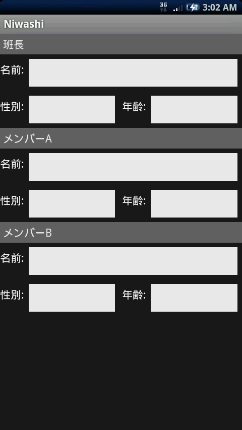 <?xml version="1.0" encoding="utf-8"?> <LinearLayout xmlns:android="http://schemas.android.com/apk/res/android" android:orientation="vertical" android:layout_width="fill_parent" android:layout_height="wrap_content"> <TextView android:id= "@+id/title" android:layout_width="fill_parent" android:layout_height="wrap_content" android:text= "Title"/> <LinearLayout android:orientation="horizontal" android:layout_width="fill_parent" android:layout_height="wrap_content"> <TextView android:layout_width="wrap_content" android:layout_height="wrap_content" android:text="名前:"/> <EditText android:id="@+id/name" android:layout_width="fill_parent" android:layout_height="wrap_content"/> </LinearLayout> <LinearLayout android:orientation="horizontal" android:layout_width="fill_parent" android:layout_height="wrap_content"> <TextView android:layout_width="wrap_content" android:layout_height="wrap_content" android:text="性別:"/> <EditText android:id="@+id/gender" android:layout_width="0dp" android:layout_height="wrap_content" android:layout_weight= "1"/> <TextView android:layout_width="wrap_content" android:layout_height="wrap_content" android:text=" 年齢:"/> <EditText android:id="@+id/age" android:layout_width="0dp" android:layout_height="wrap_content" android:layout_weight= "1"/> </LinearLayout> </LinearLayout>そしてそのxmlをincludeして画面を作ります。