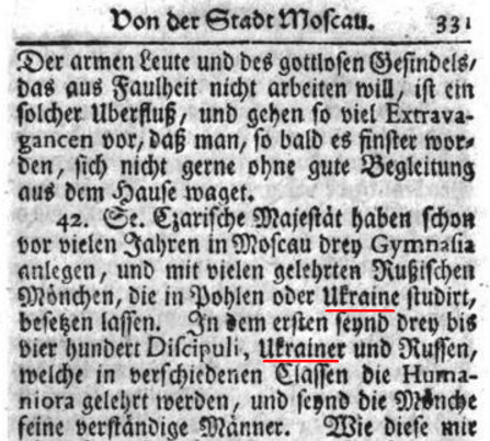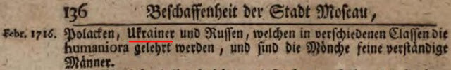 P. 136 - "Москва. Лютий, 1716 року. Поляки, Українці і Росіяни, в різних класах гуманітарні науки вчать, і ченці прекрасні розумні люди".