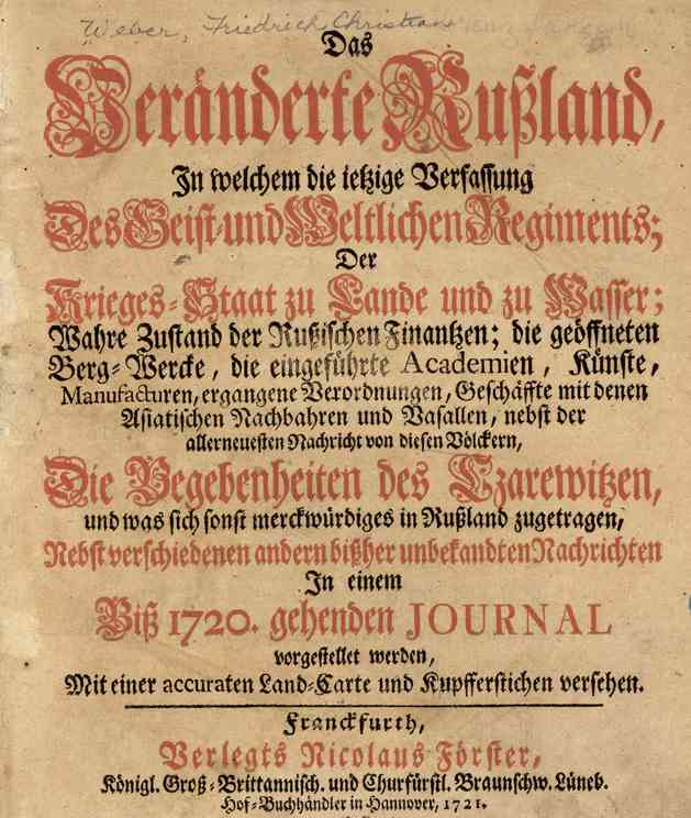 Friedrich Christian Weber. Das veranderte Russland. — Franckfurth, N. Förster, 1721