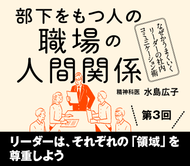 最近、対人関係の問題などで心を病む人が増えています。会社は多くの人が集まる場所。そこには、上司や先輩、同僚、部下や取引先など、多くの人間関係が生じます。それらの関係は、いずれもストレス要因になり得ます。職場のストレスをなくし、働きやすい環境をつくるのは、現場を預かるリーダーの仕事のうち。本連載では、『部下をもつ人の職場の人間関係』を上梓した対人関係療法の第一人者で精神科医の水島広子氏が、職場のストレスをなくし、円滑な人間関係をつくるコミュニケーションのコツをアドバイス。第3回は、職場のリーダーが考えるべきメンバーの「領域」について説明します。
