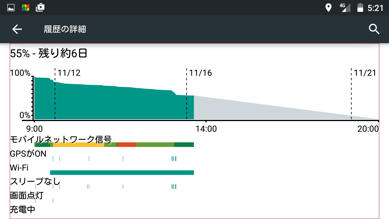 またバッテリー持ちも、待ち受けで約5日充電せずにいても、バッテリー残量は50%以上。スマホにしてはかなり持ってます。