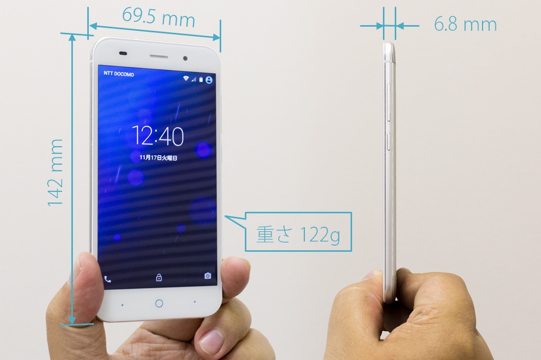 本体は厚さ6.8mm、重さ122gと薄くて軽く、質感も高くて全然安っぽく見えません。サイズはiPhone 6よりちょっと長いくらい。