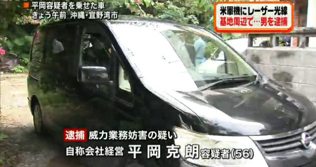 在沖縄米海兵隊によると、普天間上空の米軍機に、昨年7月から今年11月にかけて、レーザー照射を計5回されたという。 平岡克朗容疑者は容疑を認めている。