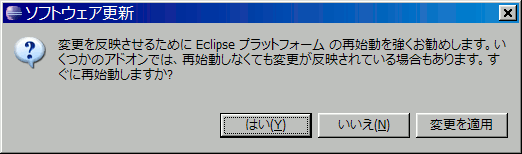 - 少し待った後、インストールが完了すると↓のダイアログが出てきますが、とりあえずここは「変更を適用」をクリックした後Eclipseを終了。