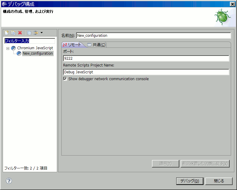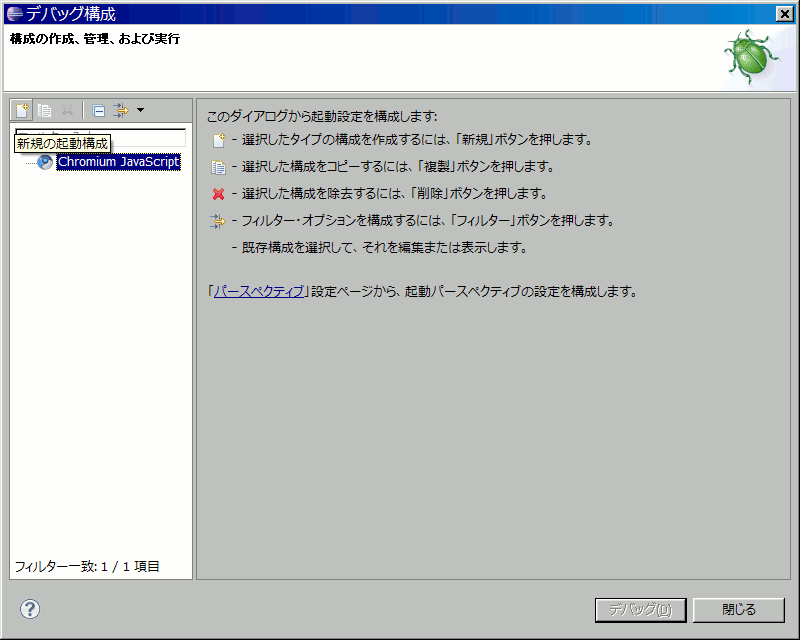 - 左の一覧の中から「Chronium JavaScript」を選択して(多分一覧にはこれしか出ない)、左上の「新規の起動構成」ボタンをクリック