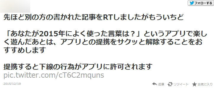 以前からツイしてますが TLで見かけたので 「あなたが2015年によく使った言葉は?」 ↑がそうであるように 下図のような条件下で認証したアプリは その後念のため、許可を取り消しましょう アクセス権 読み書き←これ危険です pic.twitter.com/AAsq1RKDe7