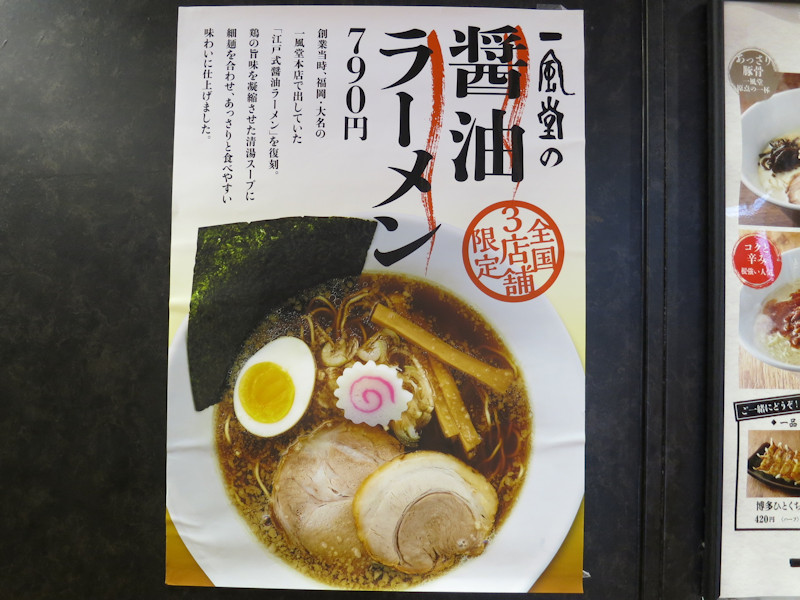 サイトでは「豚骨ラーメンを主力商品とする一風堂ですが、実は創業当初から「江戸式醤油ラーメン」の名で醤油ラーメンをご提供しておりました。」との紹介されています。