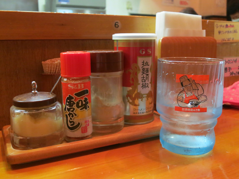 卓上にはおろしニンニク、一味唐からし、白胡椒、拉麺胡椒。
