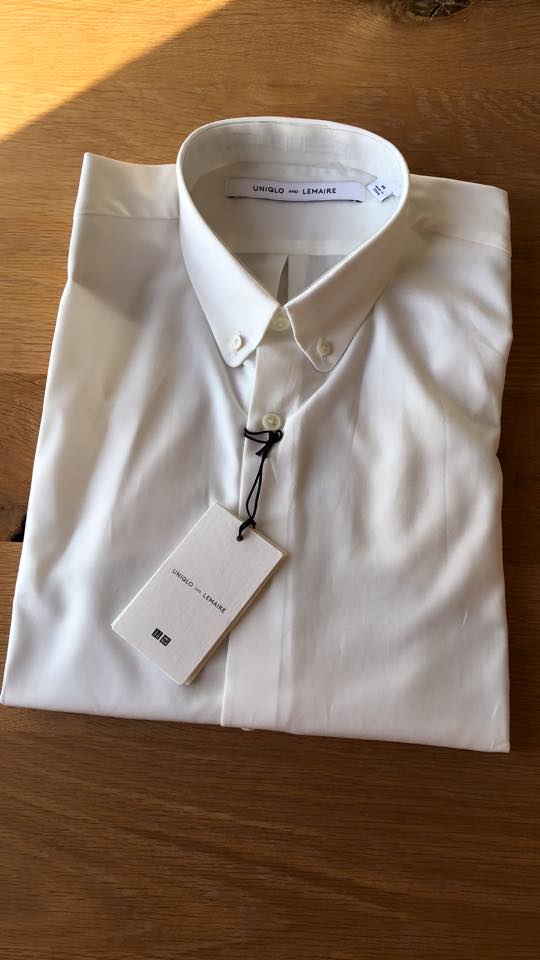 10月くらいに発売されたユニクロとクリストフ・ルメールのコラボアイテム。ほかにジャケットやニットやスウェットパンツなどがありました。しかしニットの素材の微妙さにはがっくりきましたし、ジャケットも超いまいち。唯一、よかったのが白シャツでした。小さめの襟はおもしろいデザインですが、その他はすごくシンプル。着丈も短めでフィット感もよかったです。白の場合、素肌の上に着ると乳首が浮きまくるという声もありますが、何を言ってるんですかそういうものです。
