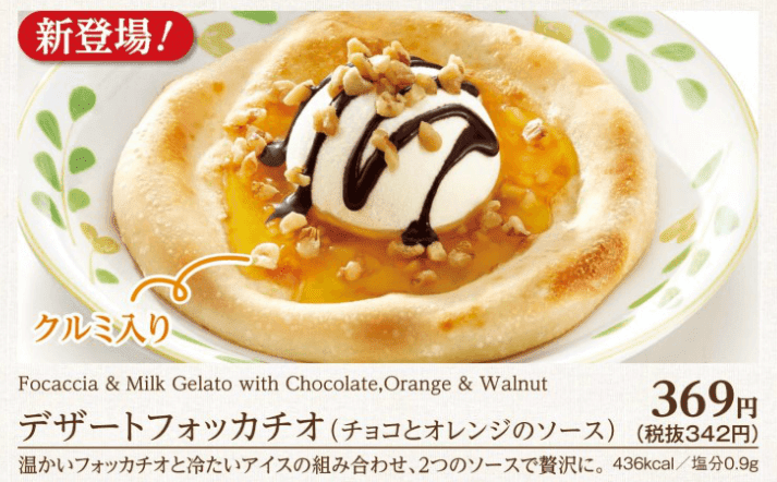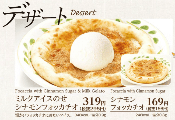サイゼリヤには季節のデザートというメニューがあり、これにもフォッカチオが利用されています。