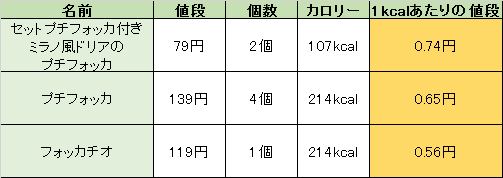 プチフォッカはフォッカチオより20円も高いですが、カロリーはどちらも214kcalです。同じサイズのフォッカチオを4分割しているだけで20円も高いのがプチフォッカです。