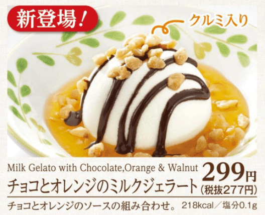 上に乗っている部分の『チョコとオレンジのミルクジェラート』だけを切り出すと299円です。『チョコとオレンジのミルクジェラート』と『シナモンフォッカチオ』をそれぞれ単品で頼んだ方が1円お得ですね。