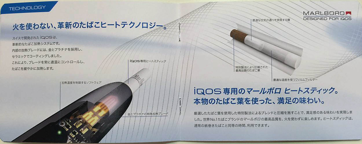 そもそもこの装置を電子タバコと呼んでよいのかどうか、P社のパンフには革新のヒートテクノロジーというワードは何度も出てくるが、電子タバコという言葉は一度も出てこない。といっても、電子タバコの定義もあやふやなので、これを電子タバコと呼ぶことに異論は出ないと思う。