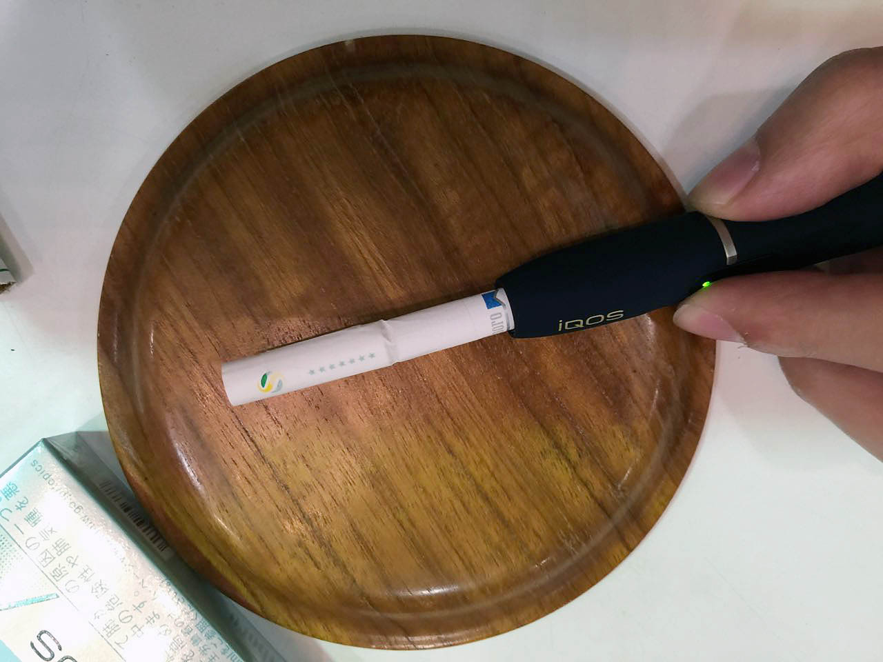 iQOSを試す前に吸ったSevenStars Menthol Smash(カプセルをつぶしてアップルの香りが楽しめるもの)の激しい着香のようなものが合うんじゃね〜か、と話していたら、早速メンバーが魔改造ヒートスティックを作った。通常のスティックのフィルターの後ろにSmashのカプセル入りフィルターを手巻き用の紙でつなげたもの。JTとフィリップモリスの合作だ。カプセルをプチッとしてヒートする。