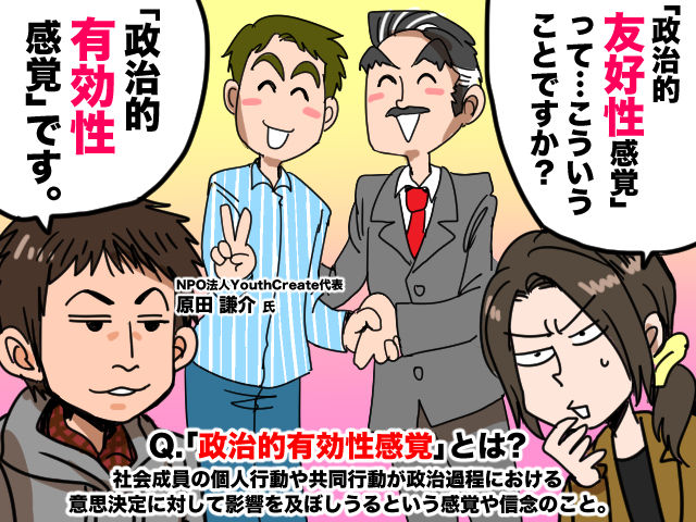 「こういうの、政治的有効性感覚(Political Efficacy)っていうんですけど……簡単に言えば、『自分の行動は政治に影響を与えることができる』という個人の感覚、信念のことです。自分の望みの政策が通ったりすればもちろんその感覚は強まりますけど、意見がたとえ通らなくても、『ちゃんと最後まで話を聞いてもらえた』とか、『深く議論をすることができた』という経験があればそれは広い意味での有効感覚につながりますよね」