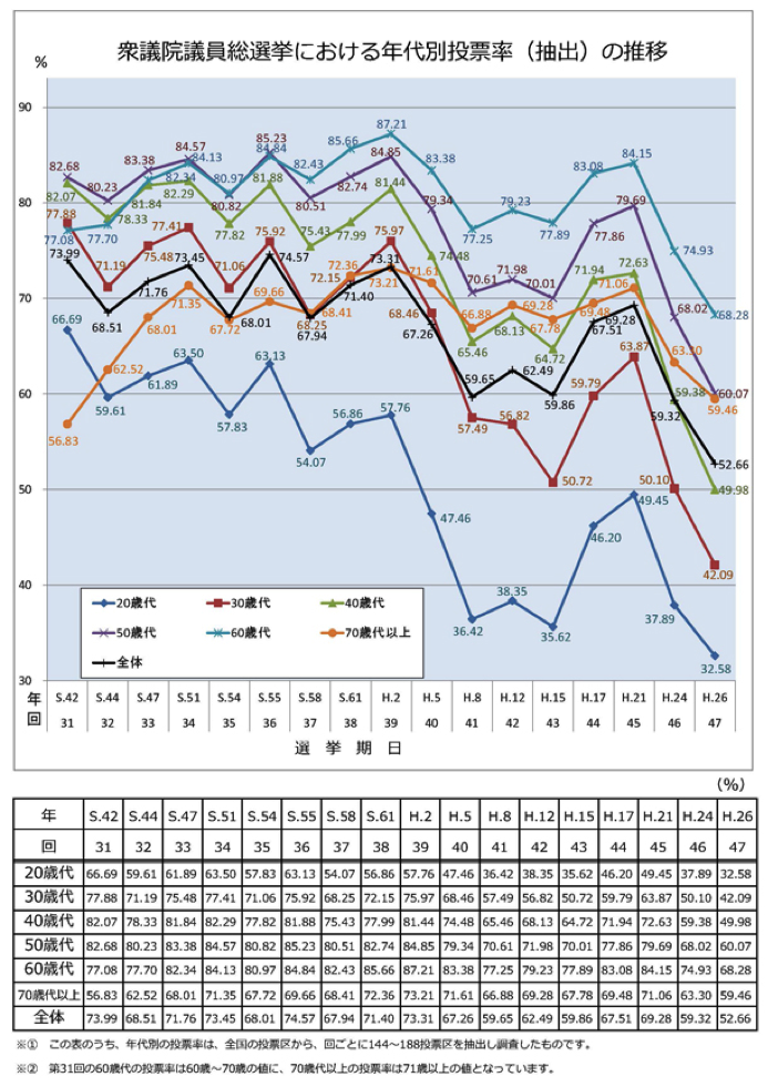 「うーむなるほど、平成21年(2009)の衆議院議員総選挙の投票率は69.28%。それが平成26年(2014)には52.66%まで下がってますね。世代別に見ると、20代の投票率が平成26年にはとうとう30%台前半に……3人に1人しか選挙に行かないってことですね」