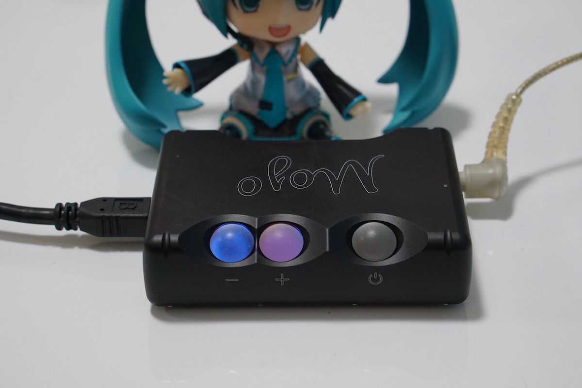 この他、WindowsやMacとは付属のケーブルのみで接続できます。ちなみにこの光ってる玉は音量ボタンであり、色で音量やサンプルレートを示唆しています。サンプルレートや音量の上下で色が変わる仕組み。