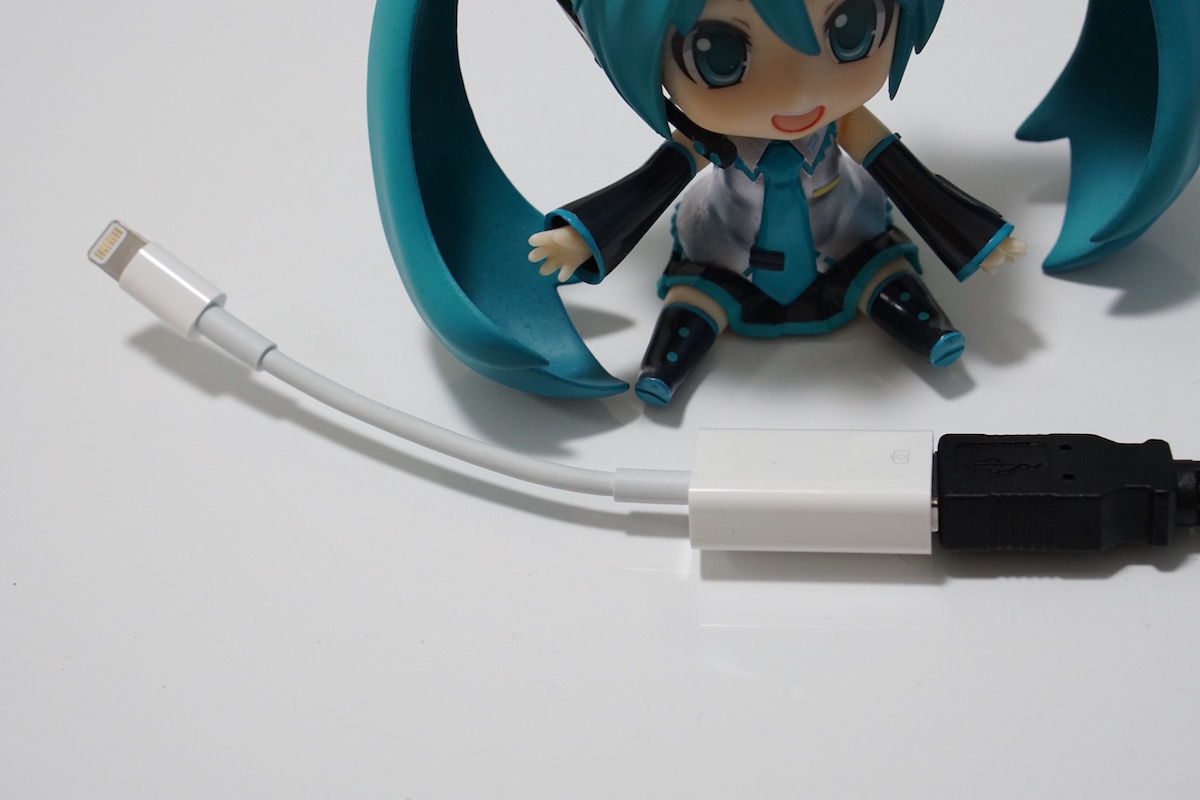 で、ここからはiPhoneとの接続をちょっと説明。まず、ケーブルは別売りの「Lightning - USBカメラアダプタ」を利用します。Apple公式の製品のため当然ぼったの3780円。ただ、これがないとiOSデバイスはどうにもならないのです。