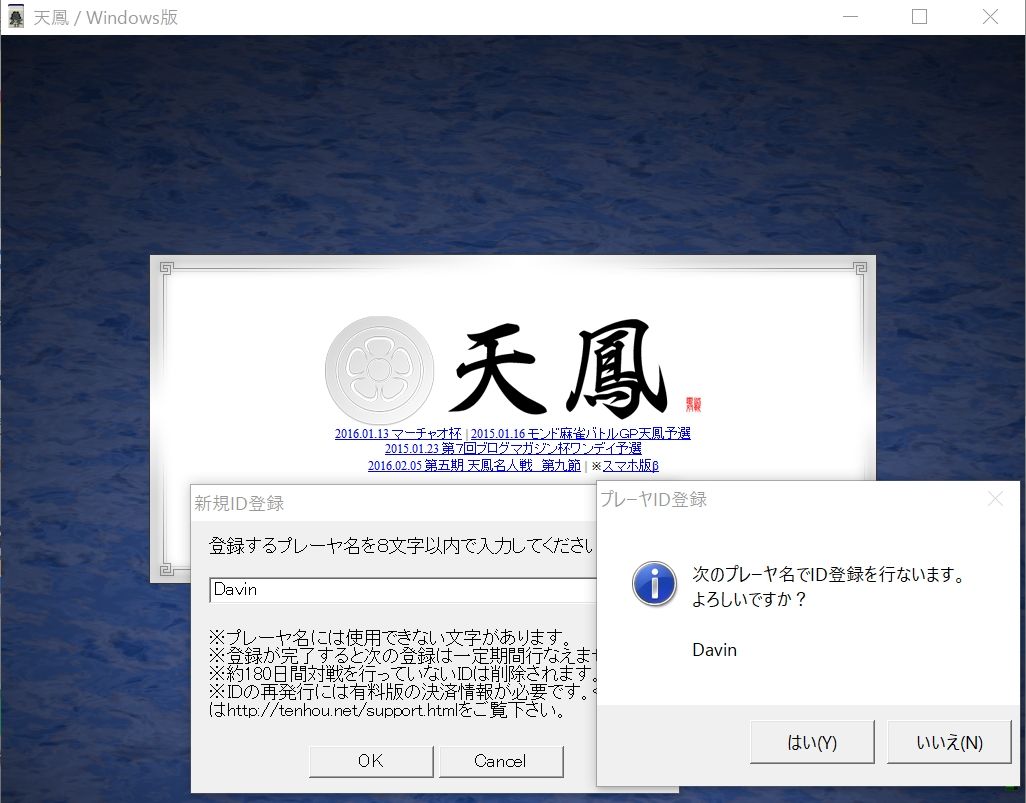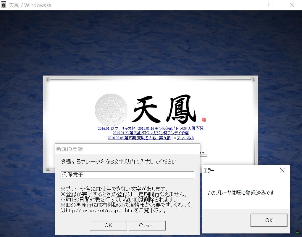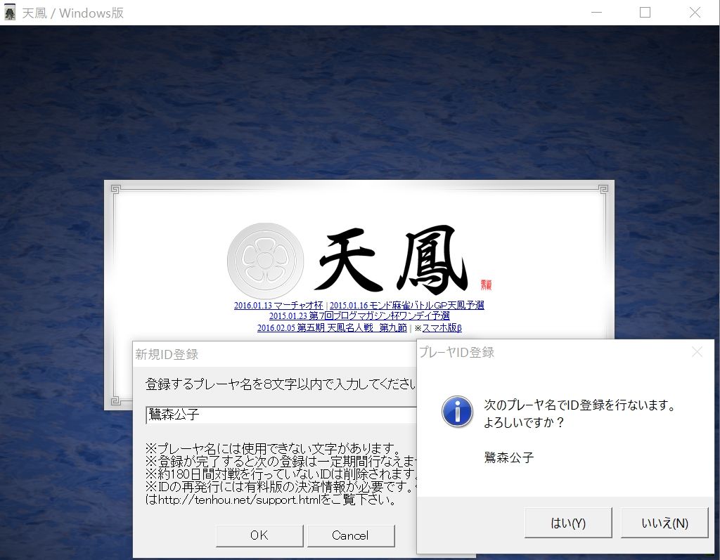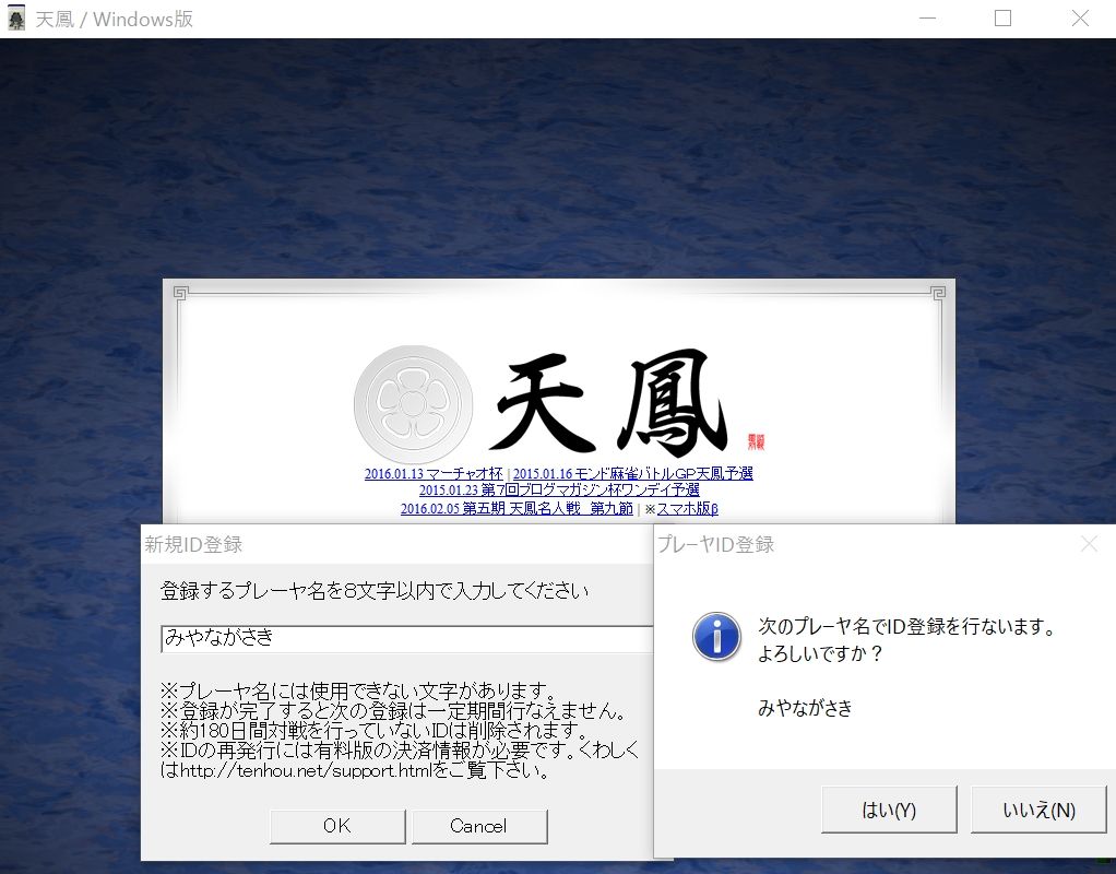 ちなみに天鳳は約180日対戦をしないとIDが削除されるそうなのでどうしてもキャラ名のIDが欲しい人は定期的に新規登録してみるといいかもしれませんね。